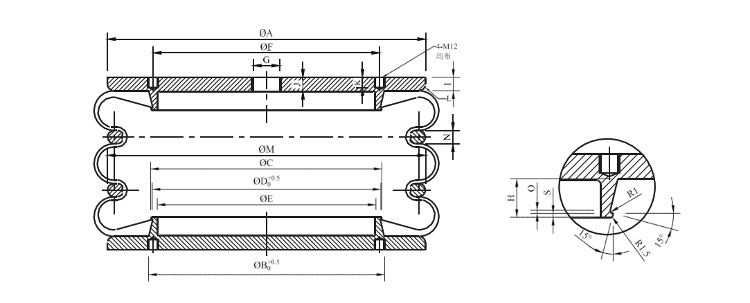 空氣彈簧是一種帶有金屬端蓋的高技術(shù)彈性波紋管。我們的標(biāo)準(zhǔn)空氣彈簧一般由 4 層組成。