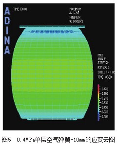 對自由膜式空氣彈簧的模擬工況為:空氣彈簧壓縮到-10mm位移時,對有限元模型腔內(nèi)分別設(shè)定0.3MPa和0.4MPa的初始壓力,研究不同初始壓力對空氣彈簧垂直剛度.性的影響,應(yīng)力和應(yīng)變的云圖如圖2圖5所示。